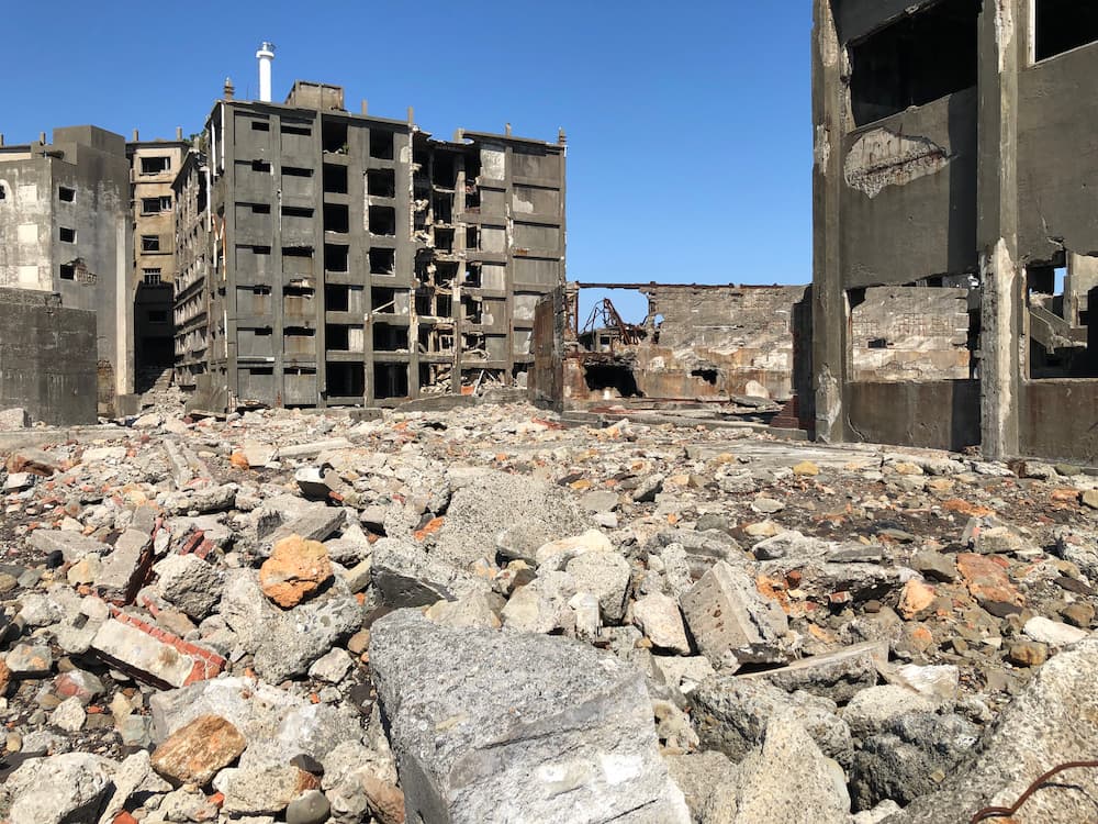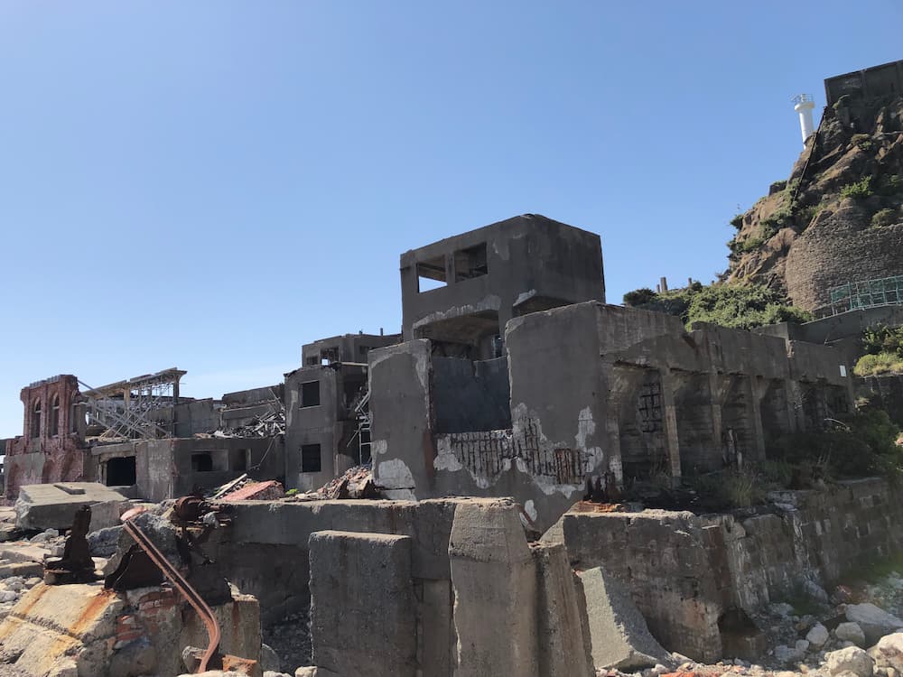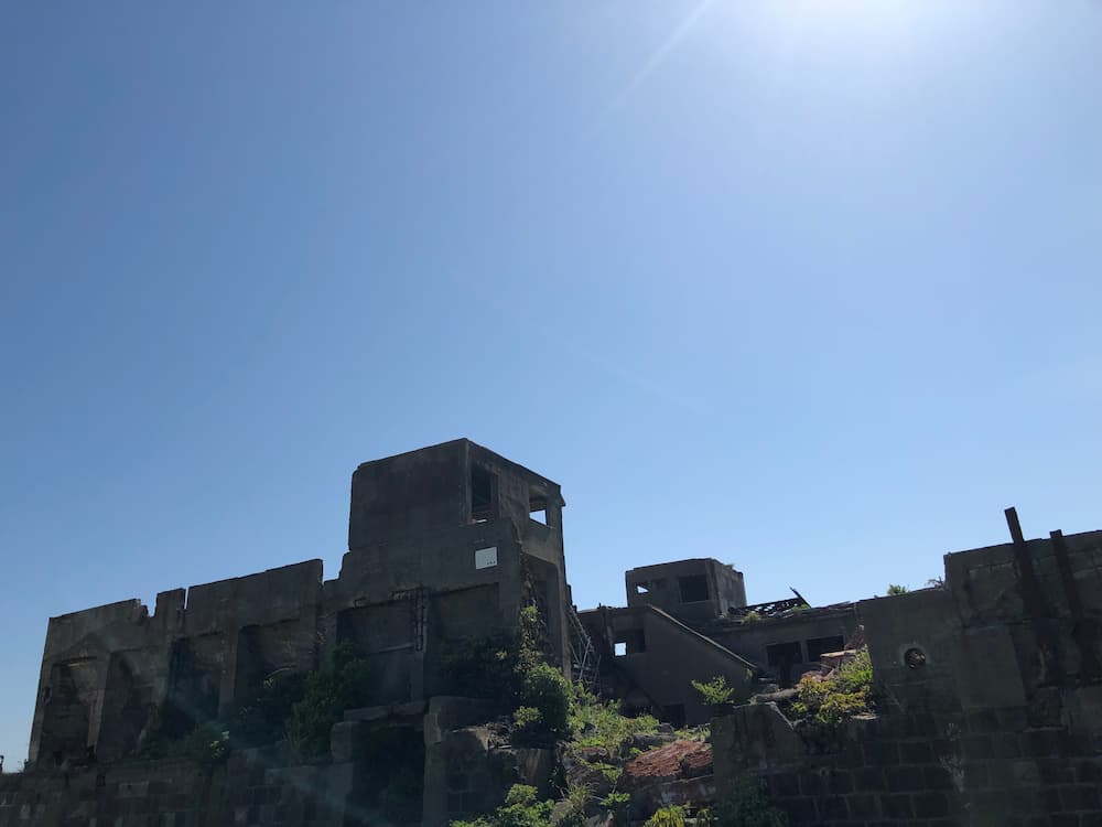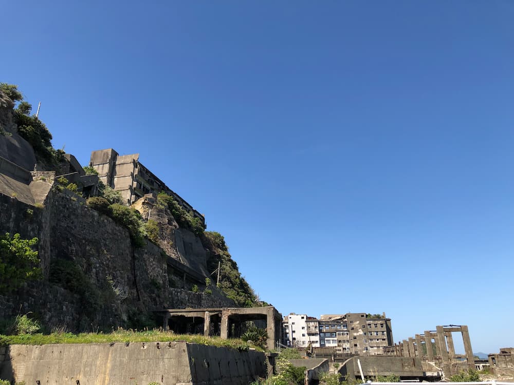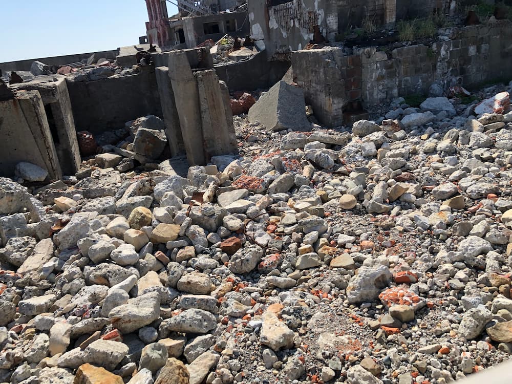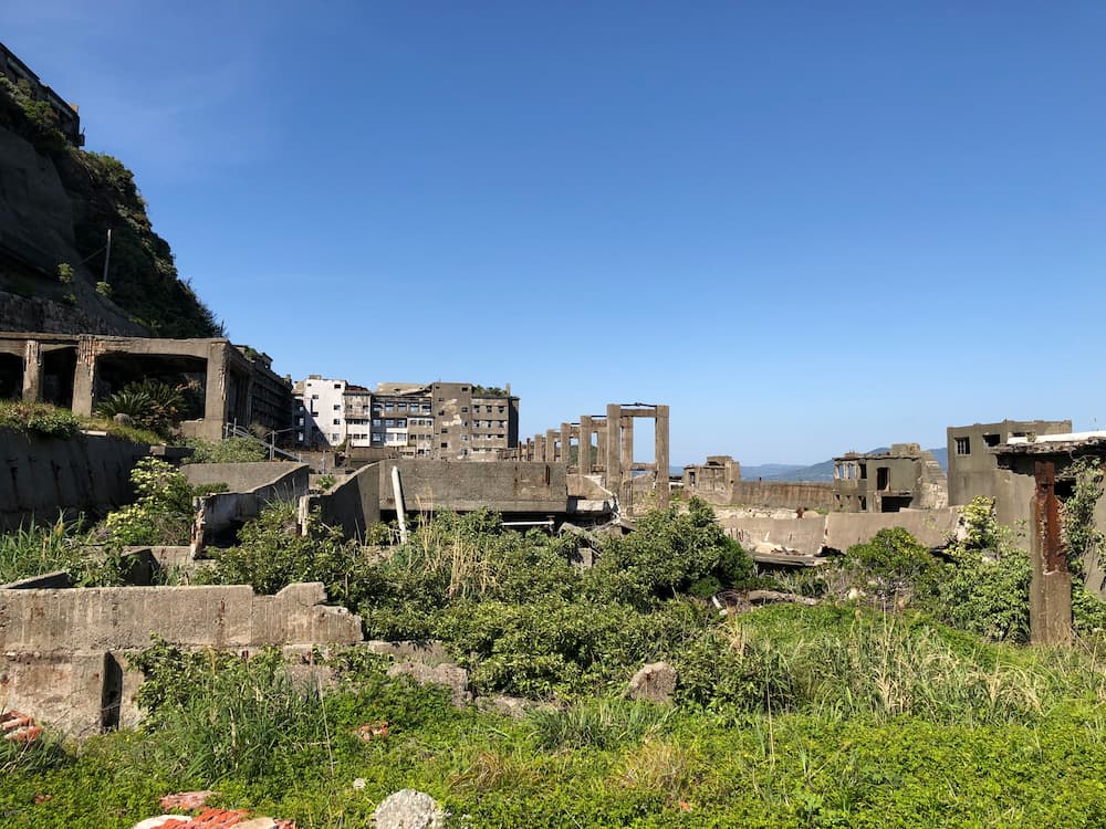 軍艦島と聞くと“コンクリートの廃墟だけ”というイメージでしたが、実際に上陸すると建物の隙間や瓦礫の上に草や低木が生えている場所があり、意外にも緑の多さに驚きました。