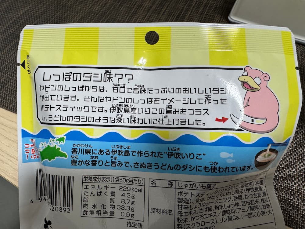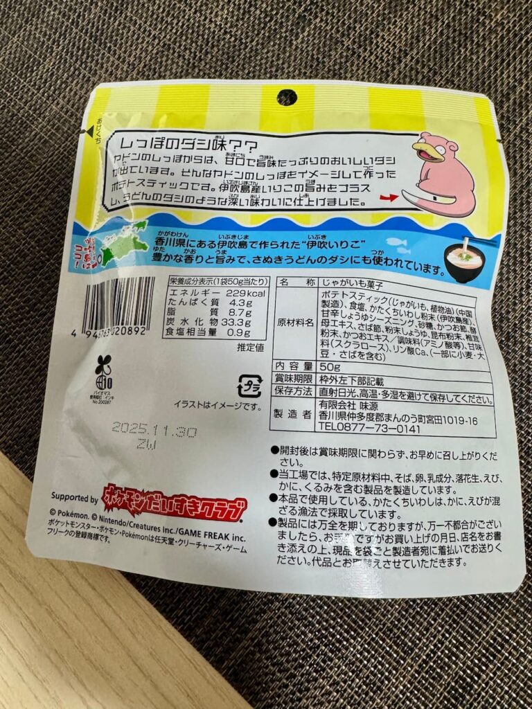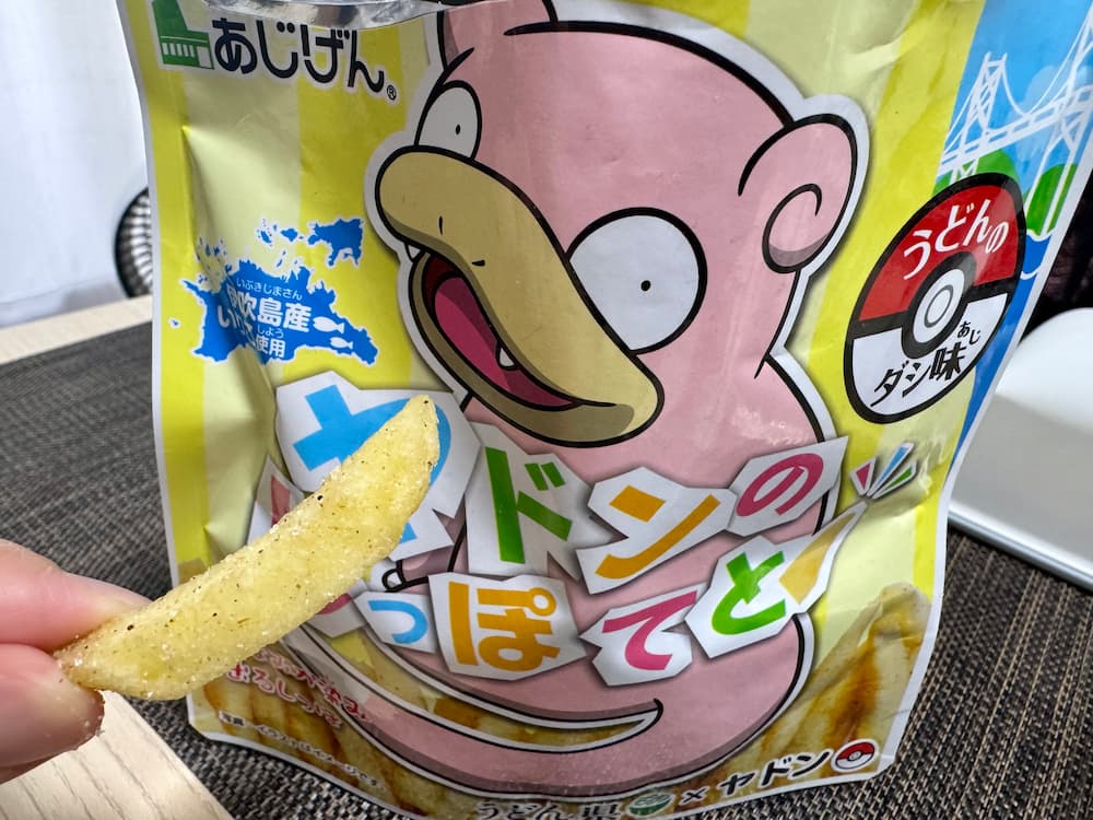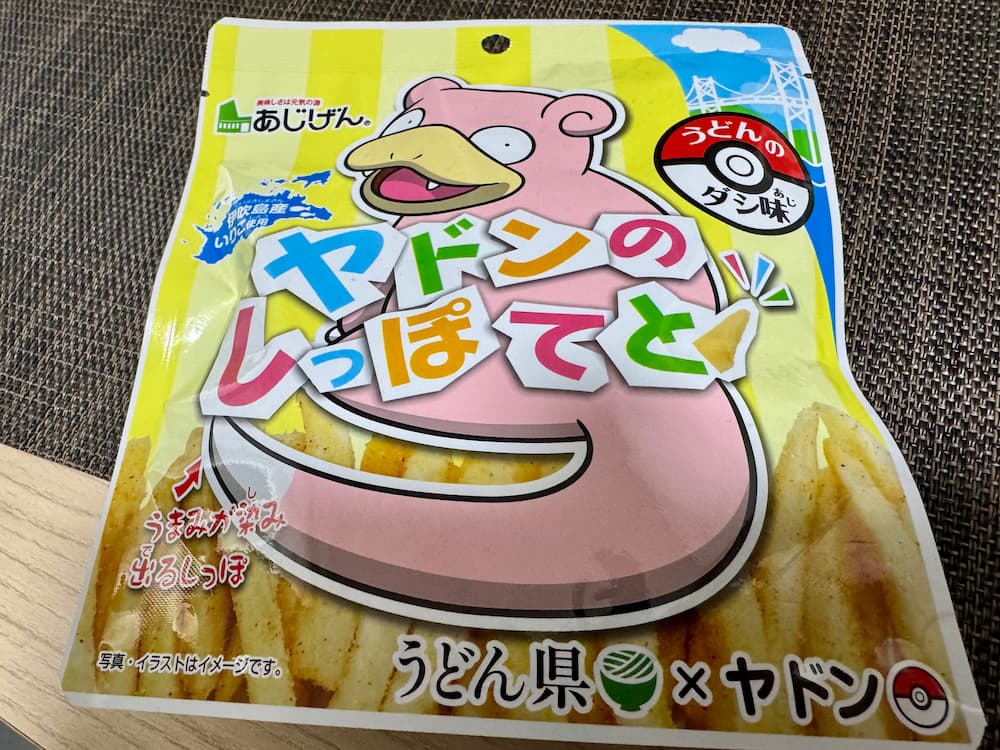 香川県のご当地スナック菓子です。ポケモン「ヤドン」のしっぽをモチーフにしたフライポテトで、見た目のかわいさはもちろん、香川ならではのいりこだしを使った味わいが特徴です。