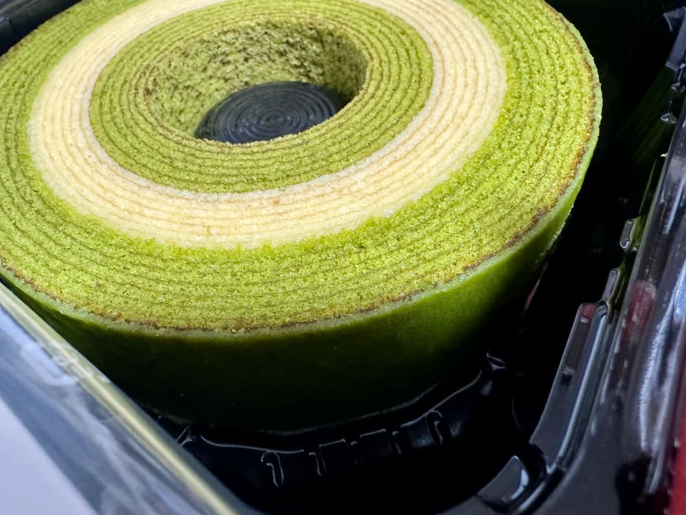 京ばあむは、見た目だけを見ると、よくあるバームクーヘンのようにも感じます。が、よく見ると側面に抹茶がコーティングされています。