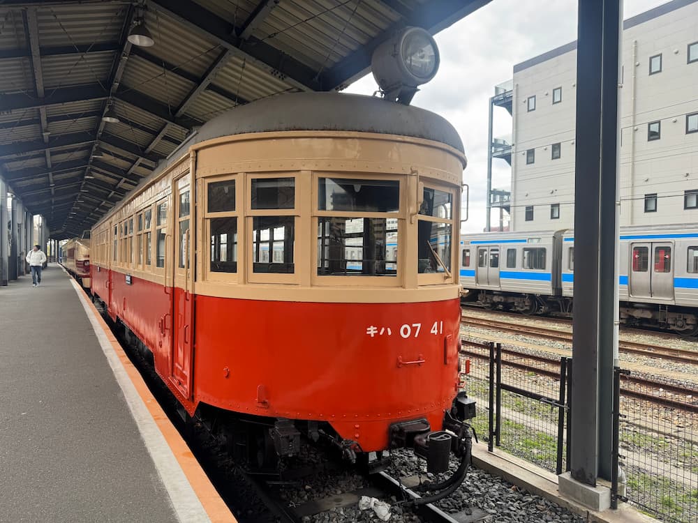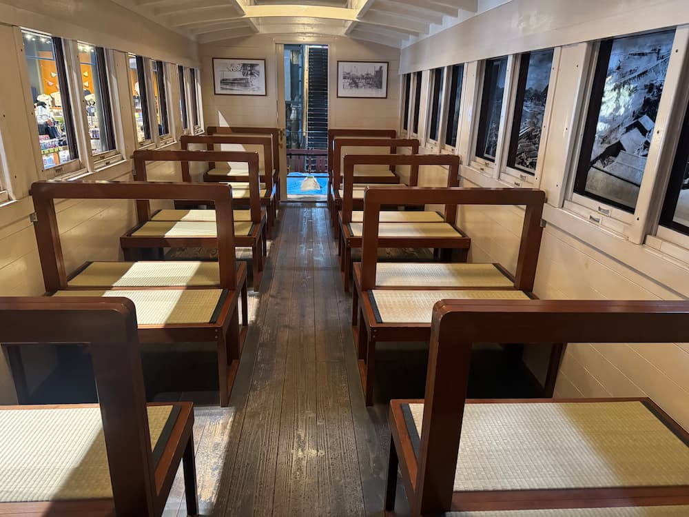こちらは重要文化財ということで中に入る事ができない車両でした。見た目がいまではない丸っこいデザインと色合いでかわいらしいです。