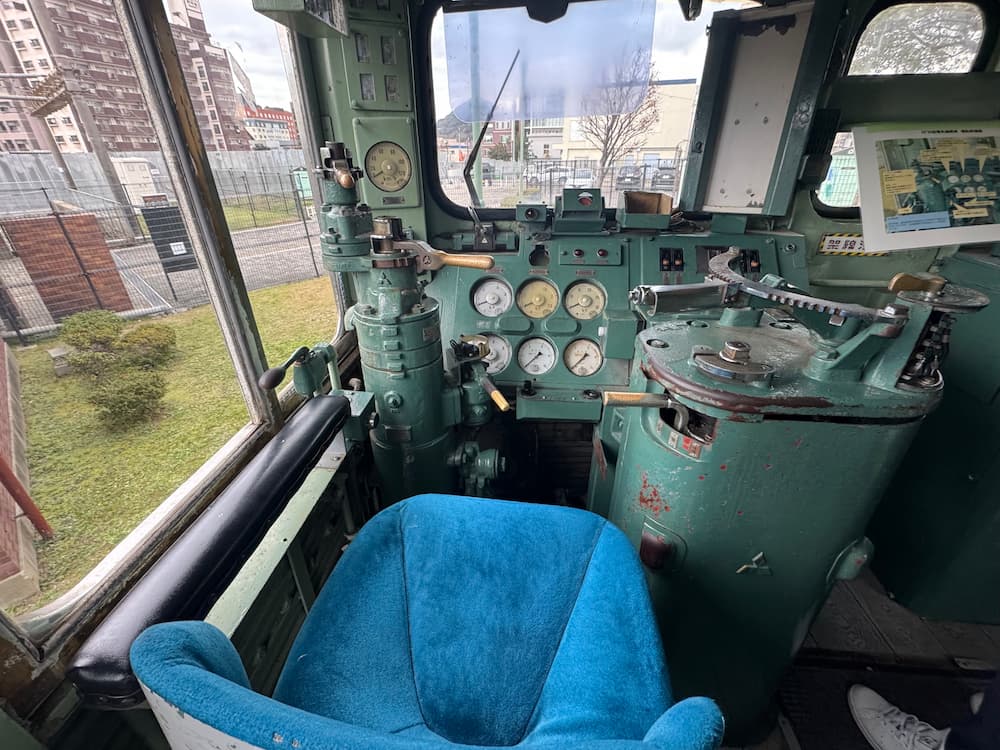 中央ゲートの近くにある車両前頭部の展示では中にはいることができ、リアルな操作部をみることができます。結構狭くてビックリしました。