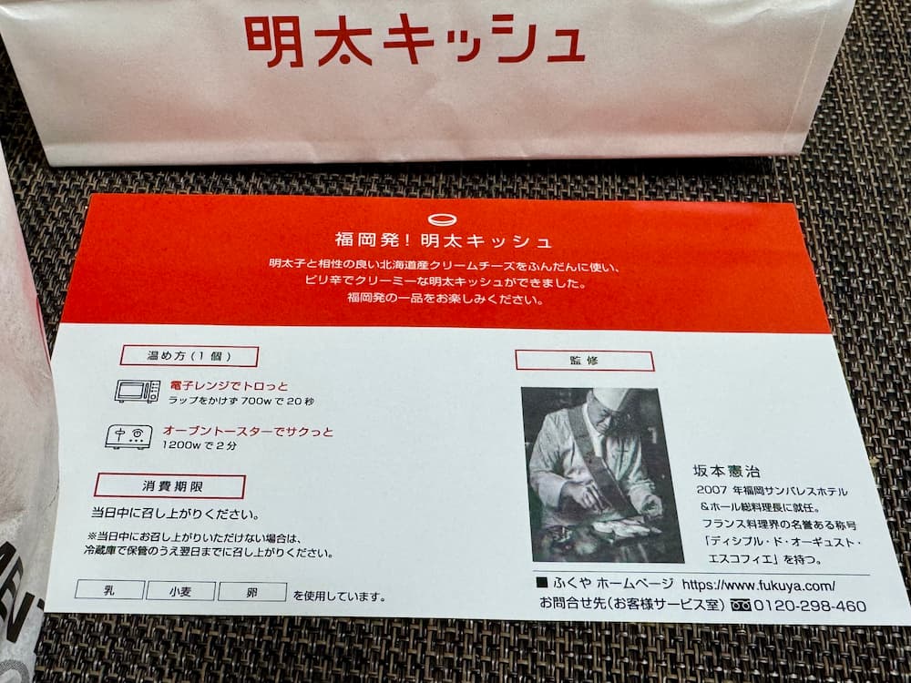 ふくやで販売されている明太キッシュは、福岡サンパレスホテル&ホール(マリンメッセの近くのホテル)総料理長である坂本シェフ監修でつくられており、本格的な一品です!