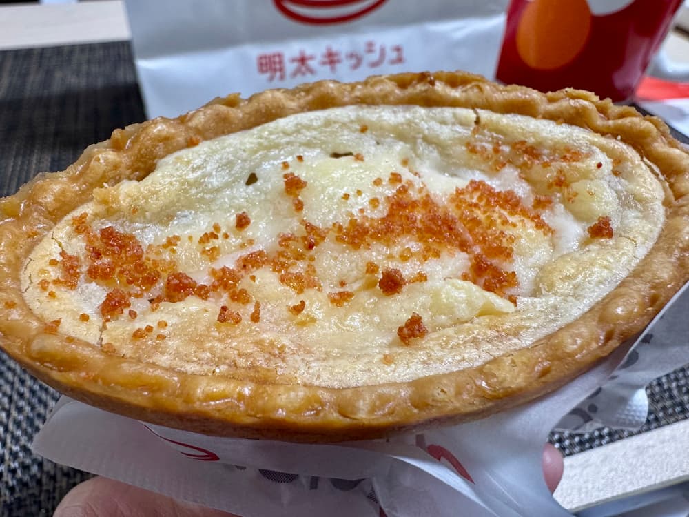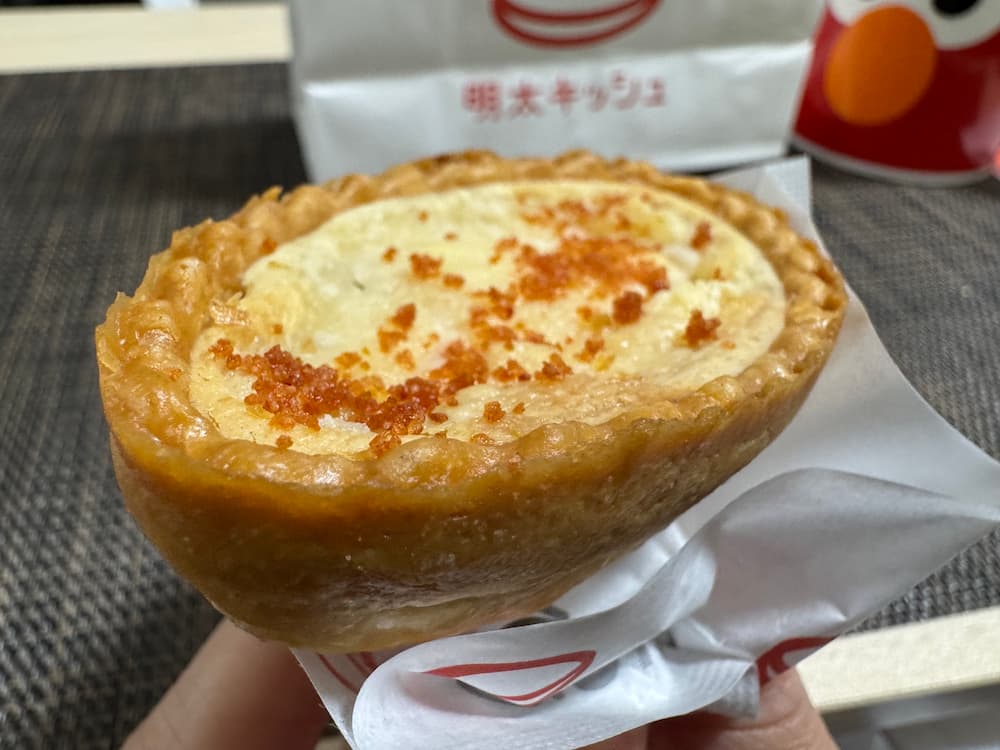 想像以上の美味しさで驚きました。ひと口食べると、クリーミーな卵のコクと明太子のピリ辛が口に広がります。このパイ生地と相性抜群です!!ありそうで今まで食べたことが無い組み合わせ。最高です!!